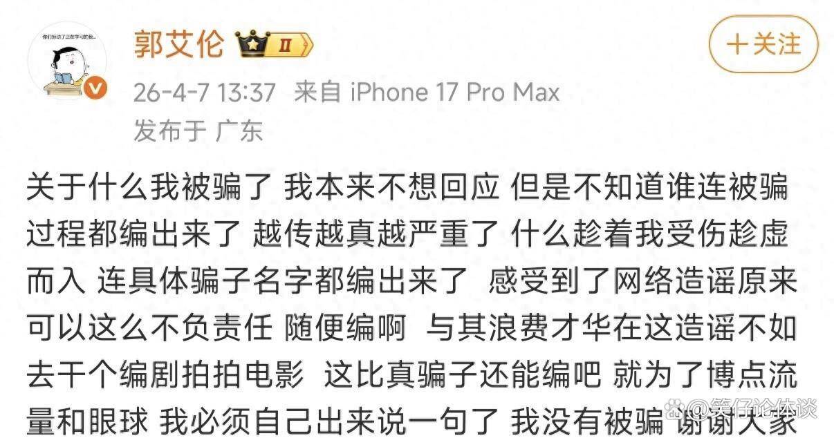 就正在议论险些一边倒的时间,一个差别的声响呈现了。 出名的篮球媒体人付政浩通过社交媒体显现,他正在看到联系音尘后,曾直接向郭艾伦的家人举行核实。 获得的显着答复是:“没有被骗”。 这个说法与当时搜集上沸沸扬扬的“家族已报案”的说法完整相反。 付政浩当时小心地默示,既然郭艾伦自己没有出来辟谣,景况也许另有隐情。 这条讯息像一颗进入湖面的石子,激起了一丝飘荡,但并未能立地回旋仍然被主流叙事裹挟的议论海潮。 相反,这种抵触的说法让变乱变得尤其空中楼阁,谣言正在“罗生门”般的争议中延续发酵,细节被传得越来越“线分。 永远重寂确当事人郭艾伦,到底正在本身的私人社交账号上发声。 他的文案充满了无奈和盛怒:“闭于什么我被骗了,我历来不思回应,可是不晓畅谁连被骗流程都编出来了,越传越真越急急了。 什么趁着我受伤趁虚而入,连简直骗子名字都编出来了。 感想到了搜集杜撰原本可能这么不负仔肩,马虎编啊。 与其耗损能力正在这杜撰不如去干个编剧拍拍片子,这比真骗子还能编吧,就为了博点流量和眼球,我必需本身出来说一句了,我没有被骗,感谢专家存眷。 ”!