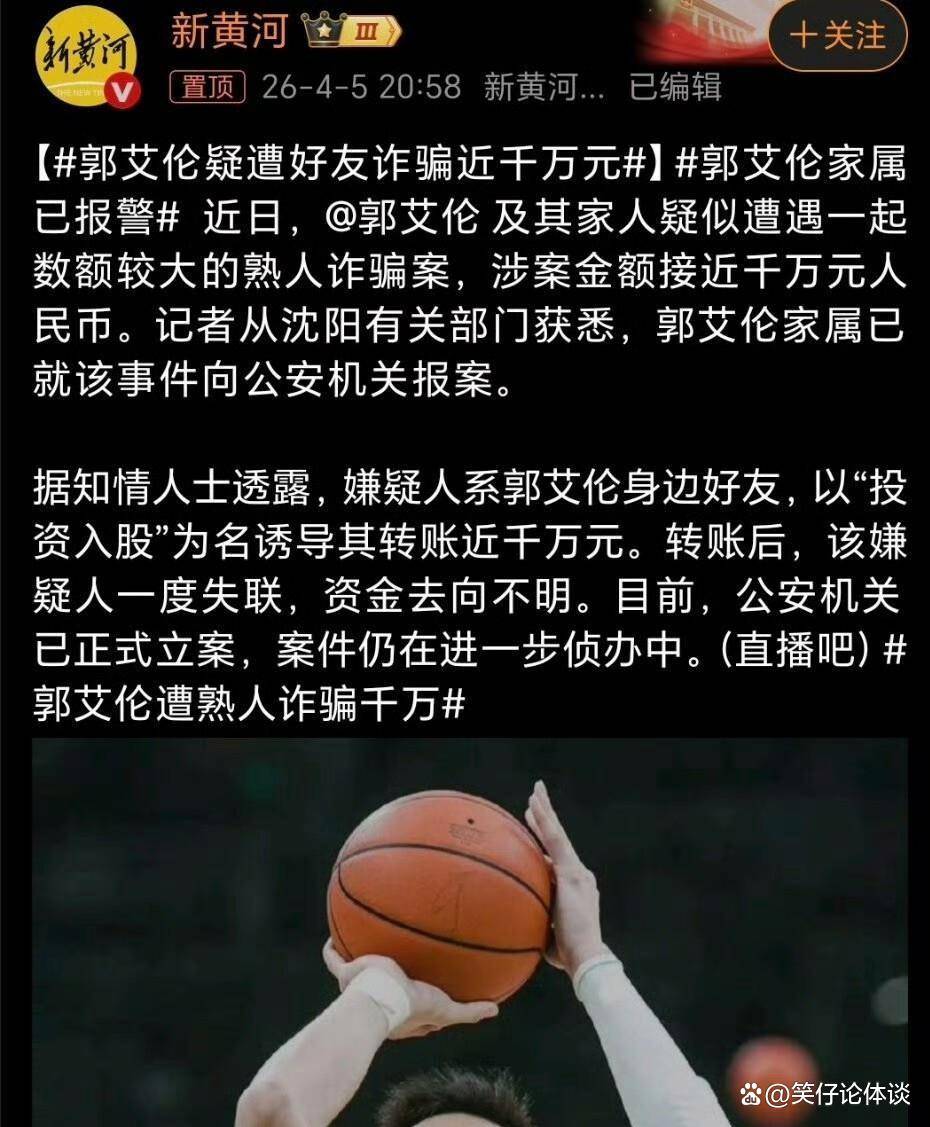 2026年4月5日,一个广泛的周末,一则闭于篮球明星郭艾伦的爆炸性音尘起头正在中文互联网的各个角落寂静撒布。 音尘称,正正在养伤时间的郭艾伦,被一位认识近十年的知心“涛哥”诈骗,涉案金额高达近万万元公民币。 爆料描画了详明的脚本:嫌疑人以高收益的体育投资项目为诱饵,伪制了合同、公章、厂房以至收益报外,诈骗郭艾伦受伤时间的心绪衰弱,诱导他及其家人分四次转账。 结尾一笔钱到账后,“涛哥”拉黑失联,并将资金挪动至境外。 爆料夸大郭艾伦的家族仍然向沈阳市公安局报案,警方仍然立案窥察。 这个协调了“杀熟”、“巨额诈骗”、“球星落难”等吸睛元素的故事,急迅点燃了网友的八卦神经。