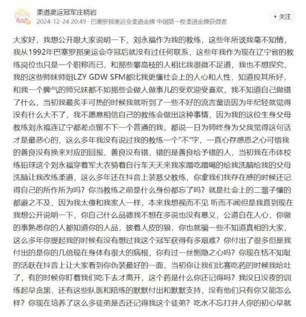 1992年巴塞罗那奥运会,庄晓岩以一记明净爽利的“背负投”,为中邦拿下首枚柔道奥运金牌,那一刻,她是举邦欢呼的好汉,而站正在她死后的刘永福,也被冠以“柔玄教父”的美誉,成为中邦柔道界的传奇教头。谁能思到,三十年后,这位奥运冠军会正在社交平台连发长文,将76岁的恩师推至言论漩涡,训斥其为“披着人皮的狼”,一场尘封众年的师徒恩仇,彻底引爆体坛。